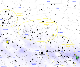 The Scorpius-Centaurus association is traditionally divided into three groups, which show slightly different ages and characteristics. The northern section is called Upper Scorpius (US) and includes all the blue stars in the northwestern part of Scorpius, including Antares, the central section, the largest, is called Upper Centaurus-Lupus (UCL) and includes almost all the stars of Lupus and most of the northern and central stars of Centaurus. The southernmost part of the association is called Lower Centaurus-Crux (LCC), this section lies in the wake of the Milky Way and includes the southern part of Centaurus with the exception of Alpha Centauri, and the Southern Cross, excluding Gacrux. The southwestern edge of the association coincides with the bright cluster of the Southern Pleiades (IC 2602).[5]