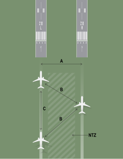 The NTZ is a 2,000-foot-wide zone, located equidistant between parallel runways or SOIA final approach courses, in which flight is normally not allowed.[5]