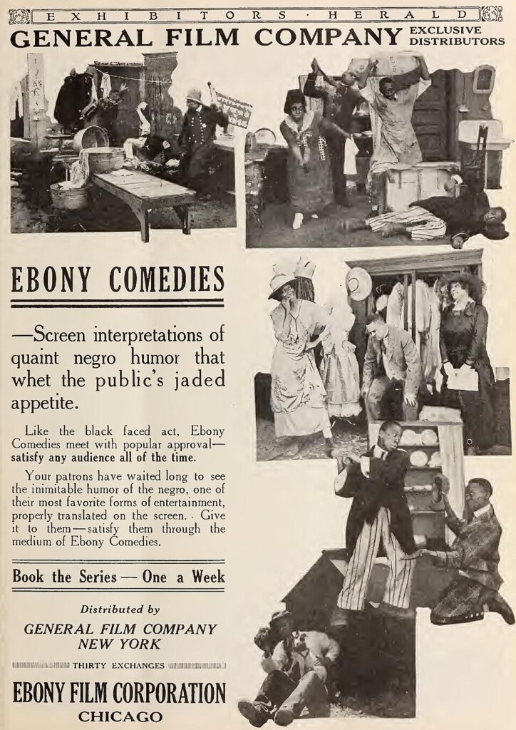 Ebony Film Corporation was an American film company established in Chicago in 1915 as Historical Feature Film Company.[1] Its films were distributed “exclusively” by General Film Company. The company’s films and its depictions of African Americans caused outrage and opposition from African Americans.[1] The company used a logo of a monkey in blackface.[2] The business folded in 1919.[3]