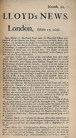 [[File:Lloyd’s News sheet.jpg|thumb|upright=1|”Lloyd’s News” from 1696]]