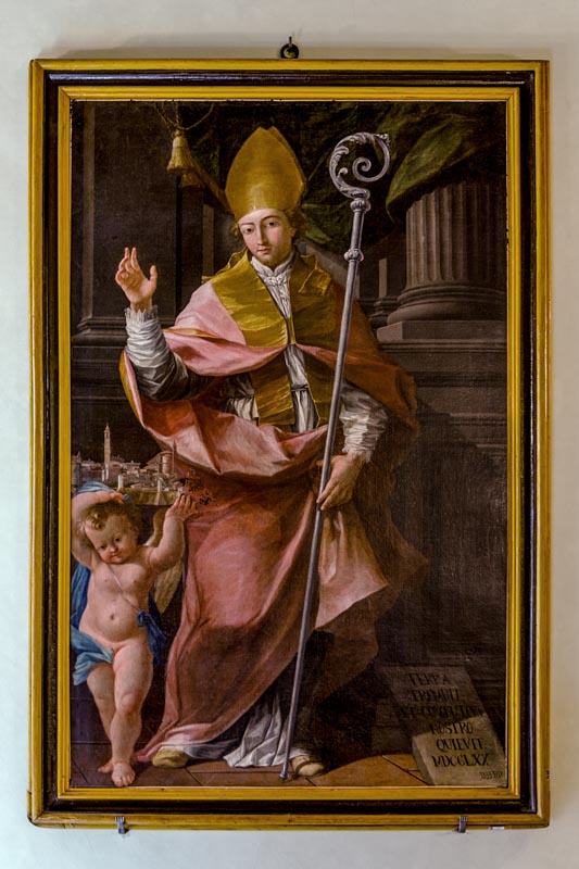 His hagiography was written probably by a monk of Frankish origin in the eleventh century, after the rediscovery of the saint’s relics, which had been conserved in a Roman sarcophagus.[1] However, his hagiography was attributed to his disciple Valentius, who was martyred with him. The cult of Saint Emygdius is ancient, documented by churches dedicated to him since the eighth century. The translation of his relics from the catacomb of Sant’Emidio alle Grotte to the crypt of the cathedral happened probably around the year 1000 under Bernardo II, bishop of Ascoli Piceno.[2]