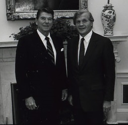 Prior to his post as Ambassador to France under President Ronald Reagan, Galbraith spent more than twenty years in Europe, primarily as an investment banker. He started his banking career at Morgan Guaranty in Paris selling and designing bonds and later became the Managing Director of Dillon Read in London in 1969. In the 1990s, he was an Advisory Director of Morgan Stanley in New York, Chairman of the Board of National Review, and a member of the board of the Groupe Lagardère S.A. Paris. Together with Daimler Benz, the Groupe Lagardère S.A. controls EADS (European Aerospace and Defense Systems), Europe’s largest defense contractor and principal owner of Airbus. Galbraith also served on several other commercial boards and until 1998, was Chairman of the Board of LVMH (Moët Hennessy Louis Vuitton) USA. He also served as a Member of the Board of Directors of the Overseas Private Investment Corporation during the latter years of Reagan’s administration.[5] Secretary of Defense Donald Rumsfeld appointed Evan G. Galbraith as his representative in Europe and the defense advisor to the U.S. mission to NATO. In making this appointment, Rumsfeld said, “I wanted a seasoned, vigorous representative in Europe who will bring experienced leadership to this important mission.”[citation needed]