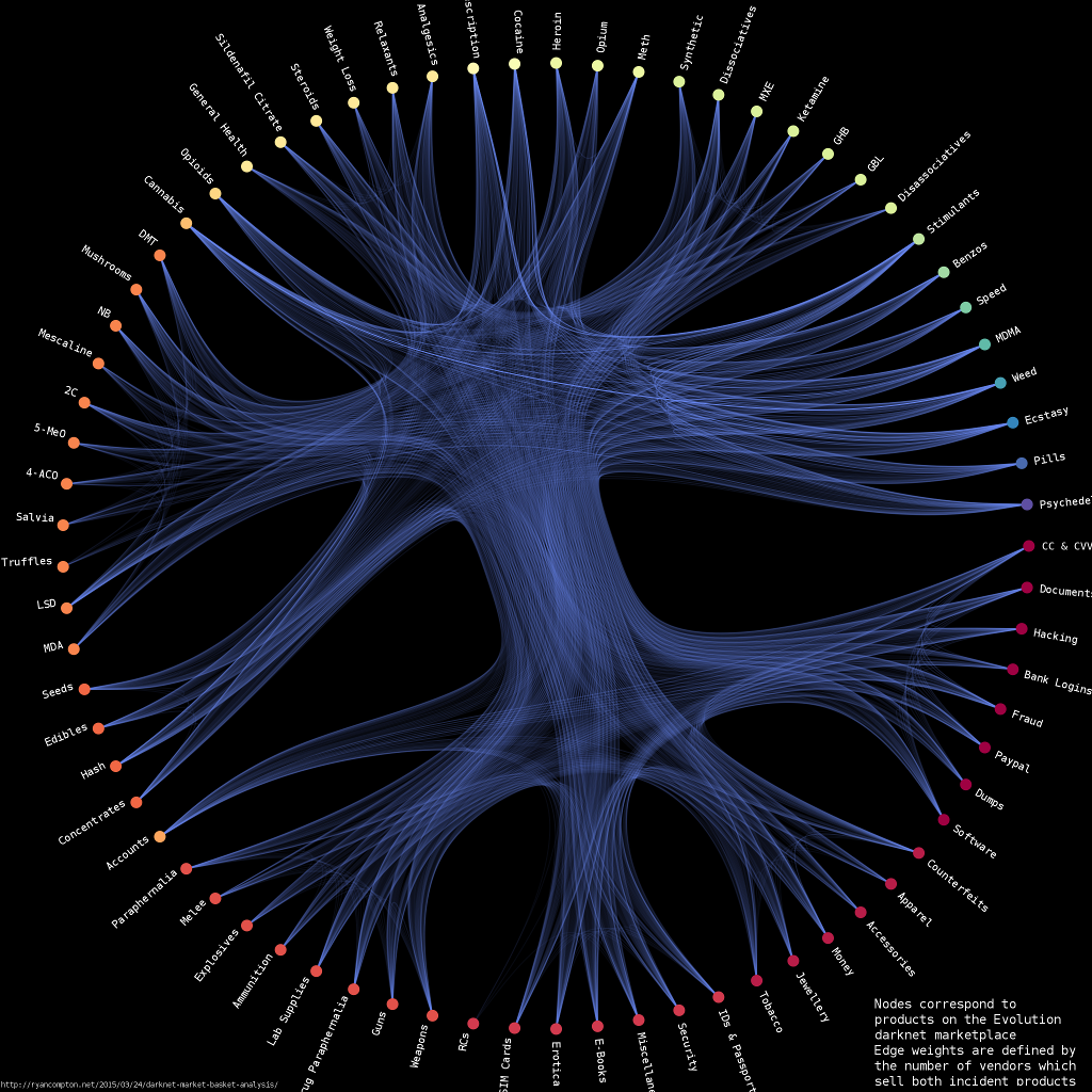 [[File:Evolution vendor category relationships.png|thumb|right|An analysis of the defunct ”’Evolution”’ marketplace shows the different types of products and vendors on a market<ref>{{cite web|last1=Compton|first1=Ryan|title=Darknet Market Basket Analysis|url=http://ryancompton.net/2015/03/24/darknet-market-basket-analysis/|website=ryancompton.net|date=24 March 2015|access-date=29 June 2015|archive-date=30 June 2015|archive-url=https://web.archive.org/web/20150630045319/http://ryancompton.net/2015/03/24/darknet-market-basket-analysis/|url-status=live}}</ref>]] |