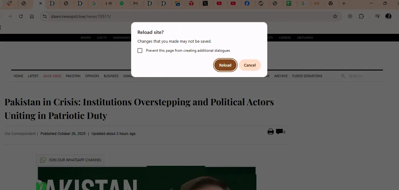A normal article on the DAWN.com website does not prompt or ask users to confirm before reloading and refreshing the page. However, the impostor article provides a prompt that asks users to confirm whether they want to reload the site at the risk of changes that were made not being saved.