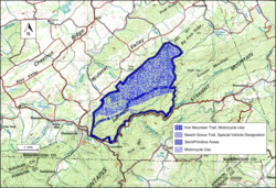 The forest service classifies areas under their management by a recreational opportunity setting that informs visitors of the diverse range of opportunities available in the forest.[13] Areas in Feathercamp include “semi-primitive motorized” around the Iron Mountain Trail, “semi-primitive-2” on the north and south, “dispersed recreation – suitable”, and “backcountry – few roads” in the center, as well as the Appalachian Trail corridor and part of the Whitetop Laurel Special Area.[3]