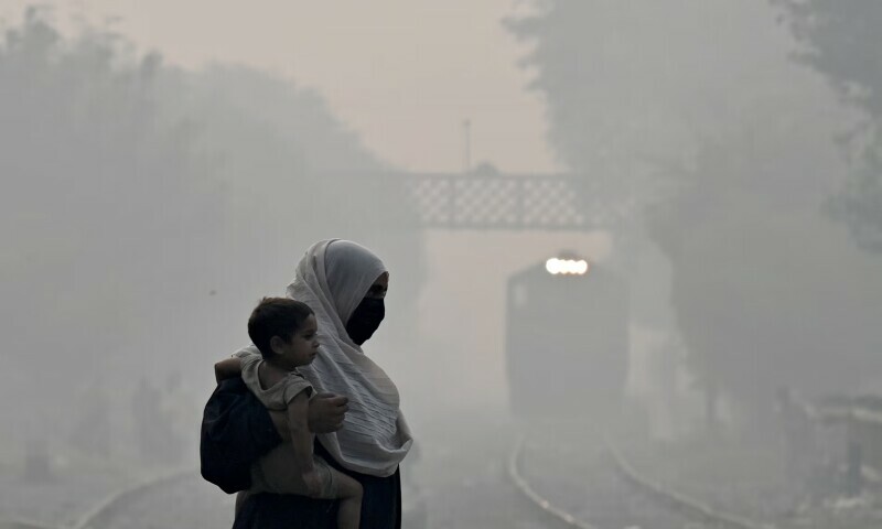 Header image: A woman carries a child as she walks across a railway track amid heavy smog in Lahore late last month. — AFP