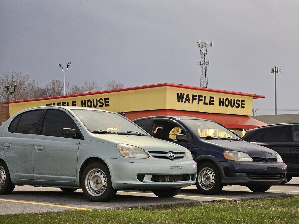 Photo taken by myself of two Toyota Echo parked in front of a Waffle House during the 2024 eclipse.