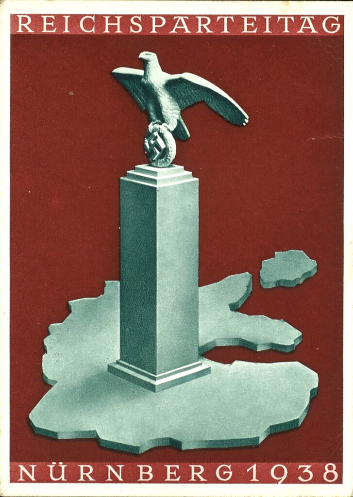 1938, Nuremberg Nazi Party Congress, celebration postcard, central publishing house of the NSDAP (the Nazi Party), Munich, with special cancel \”Nuremberg\”, transport traces. Nazi propaganda, colour postcard. German description: Festpostkarte Reichsparteitag der NSDAP in Nürnberg 5.-12.September 1938; Zentralverlag der NSDAP, Frz. Eher Nachf., München/Druck: Brend’amour, Simhart & Co., München,; Postkarte/Ansichtskarte/farbige Propagandapostkarte mit Sonderstempel “NÜRNBERG”. Deutsches / Drittes Reich, Nationalsozialismus |
