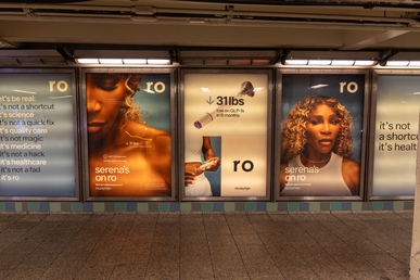 Other information Advertisements of a multi-year advertisement campaign by telehealth company Ro featuring Serena Williams are shown at a New York City subway station in August 2025.