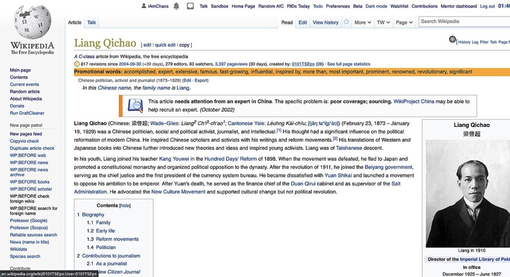 The embedded image is File:Liang Qichao portrait.jpg, which is in the public domain.
