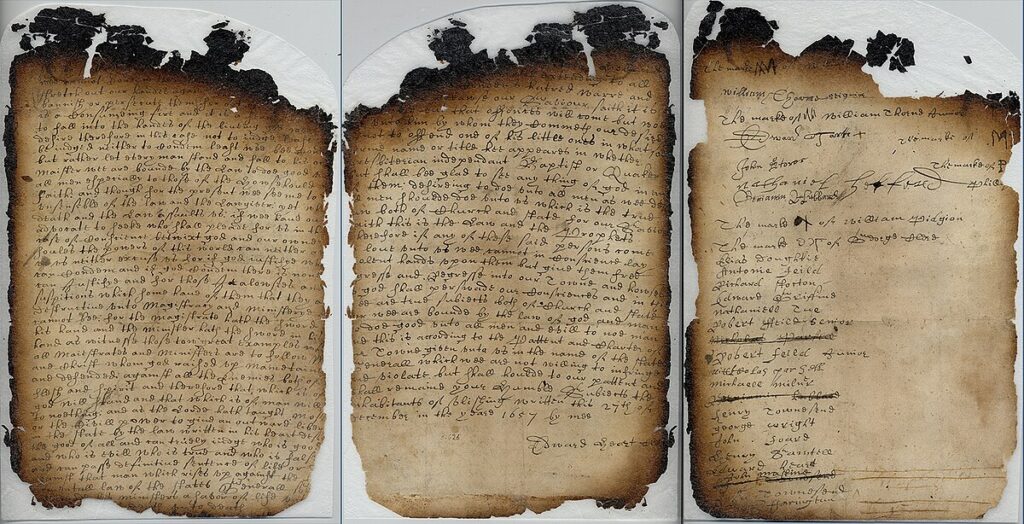 Therefore if any of these said persons come in love unto us, we cannot in conscience lay violent hands upon them, but give them free egresse and regresse unto our Town, and houses, as God shall persuade our consciences, for we are bounde by the law of God and man to doe good unto all men and evil to noe man. And this is according to the patent and charter of our Towne, given unto us in the name of the States General, which we are not willing to infringe, and violate, but shall houlde to our patent and shall remaine, your humble subjects, the inhabitants of Vlishing.