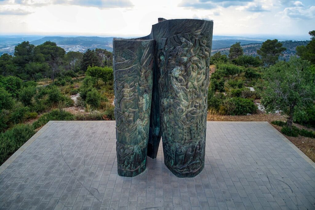 - Scroll of Fire Monument – an 8-metre-high bronze sculpture shaped like a double Torah scroll, one depicting scenes of destruction of the Jewish people in ancient and modern times, and the second depicting scenes of national rebirth.[1] Located on a hilltop, designed in the form of two cylinders, “Holocaust” and “Revival.” It serves as a memorial to Holocaust victims. The sculpture, created by Nathan Rapoport, was inaugurated in 1972.