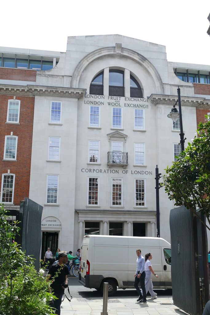 The building housed two separate exchanges: the London Fruit Exchange, and the London Wool Exchange. The London Wool Exchange was under the control of the Associated London Selling Wool Brokers (ALSWB) which consisted of nine firms.[4] The London Fruit Exchange was established by the four main auction fruit brokers in London, in conjunction with the Central Markets Committee of the Corporation of London, and held its first auction in September 1929.[5]