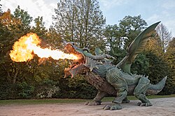 Although plans for a new dragon have existed since 2001, it wasn’t until July 15, 2006, that funding for a new dragon was announced and secured.[4] In February 2007, the main project for its realization was launched and the construction was supervised by Zollner Elektronik in Zandt. The project cost 2.3 million euros and it took almost nine years to build this walking robot[5] measuring 15.5 meters long, 3.8 meters wide, 4.5 meters high and weighing 11 tons. The dragon is capable of running at up to 12 km/h, but local guidelines limit its speed to 1.8 km/h. It can also lift and turn its head, has facial expressions, a movable tail, can spread its wings to a 12-meter wingspan, spit fire and smoke over 5 meters and roar. It is controlled by 4 people, each of whom can control a leg and an option such as fire. Due to local regulations and for added security, each person can see what the other is doing. On June 2, 2010, some 10,000 people gathered to watch the dragon arrive by truck in Furth im Wald. It has been used for the first time at the festival on July 31, 2010. The dragon is currently the largest four-legged robot in the world, and was entered in the Guinness Book of Records in 2012.[6] The title of Further’s dragon-building project was Tradinno (TRADition + INNOvation), hence its name: Tradinno.