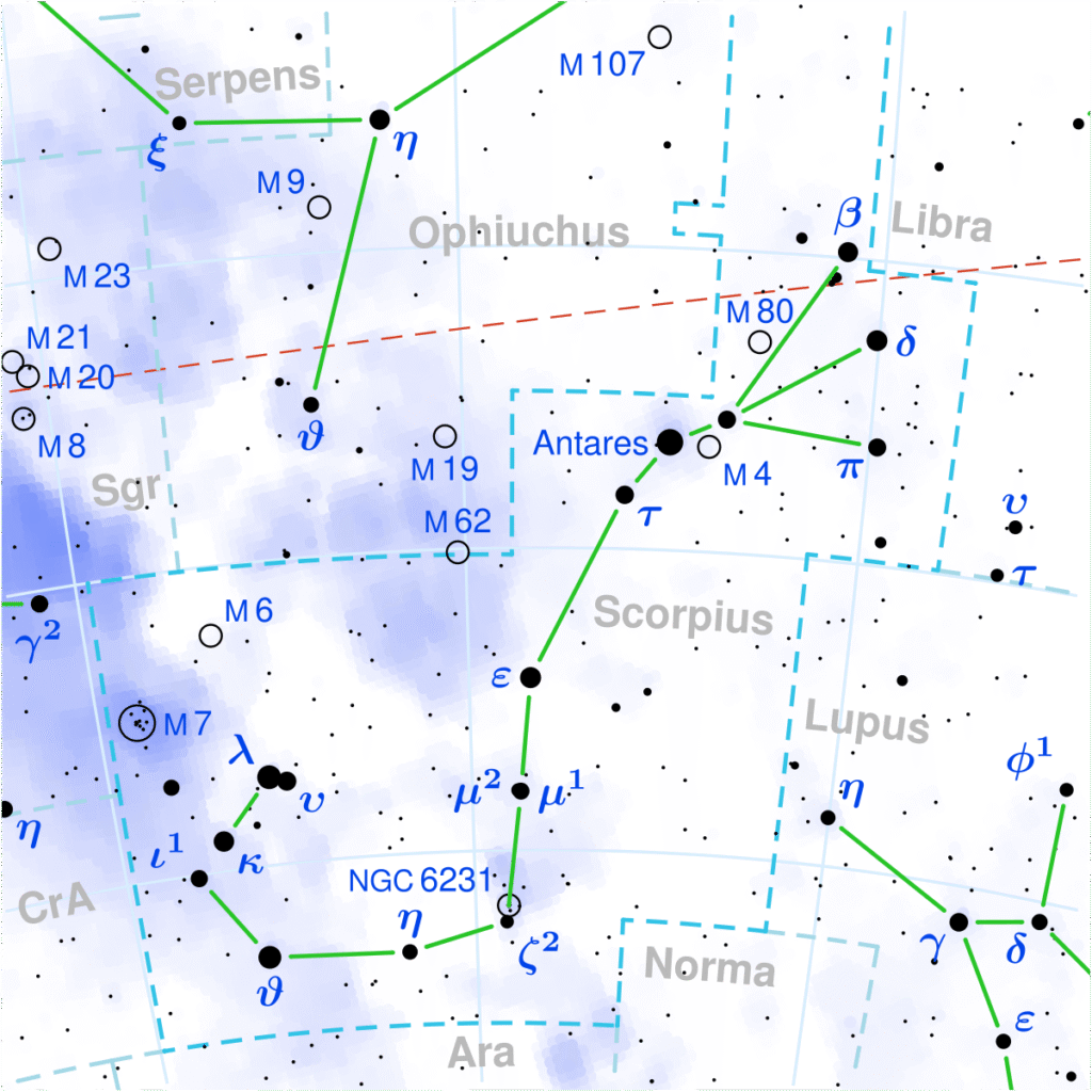 ”G Scorpii” is the star’s [[Bayer designation]]. It was formerly situated in the constellation of [[Telescopium]] where it was designated ”γ Telescopii”, [[Latinisation of names|Latinised]] to ”Gamma Telescopii”.<ref name=”ridpath” /> It was resited in Scorpius and redesignated G Scorpii by [[Benjamin Apthorp Gould]].<ref name=wagman/>