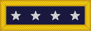 General of the Army (abbreviated as GA)[1]: 3 is a five-star general officer rank in the United States Army. It is generally equivalent to the rank of field marshal in other countries. In the United States, a General of the Army ranks above generals and is equivalent to a fleet admiral and a general of the Air Force.[1]: 5 The General of the Army insignia consisted of five 3⁄8-inch (9.5 mm) stars in a pentagonal pattern, with touching points. The insignia was paired with the gold and enameled United States coat of arms on service coat shoulder loops. The silver colored five-star chain has major insignia alone would be worn for use as a collar insignia of grade and on the garrison cap. Soft shoulder epaulets with five 7⁄16-inch (11 mm) stars in silver thread and gold-threaded United States coat of arms on green cloth were worn with shirts and sweaters.
