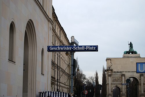 ”'{{lang|de|Geschwister-Scholl-Platz}}”’ (Scholl Siblings Plaza) is a short semi-circular plaza located in front of the main building of [[ Munich]] ({{lang|de|Ludwig-Maximilians-Universität München}}), located on the [[Ludwigstrasse (Munich)|Ludwigstraße]] in [[Munich]], Germany.<ref>{{Cite map | publisher = Google Maps| title = Google Earth Maps| cartography = Unknown| year = 2007}}</ref> The plaza is named in memory of the [[Scholl siblings]], [[Sophie Scholl]] and [[Hans Scholl]], students at [[ Munich]] during [[World War II]] who were among the founding members of the [[White Rose]] ({{lang|de|Weiße Rose}}) resistance movement.<ref>{{Cite journal|last=Frey|first=Reed|date=2019|title=Conscience before Conformity: Hans and Sophie Scholl and the White Rose Resistance in Nazi Germany by Paul Shrimpton|url=http://dx.doi.org/10.1353/nsj.2019.0012|journal=Newman Studies Journal|volume=16|issue=1|pages=124–125|doi=10.1353/nsj.2019.0012|s2cid=201765330 |issn=2153-6945|url-access=subscription}}</ref> |