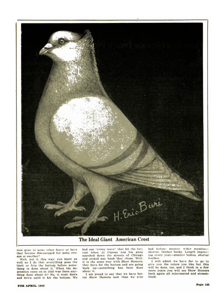 The National Pigeon Association recognized the Giant American Crest during the National Pigeon Association’s convention in Philadelphia in January 1940, adopting the name and standard of perfection concurrently.[6]