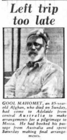 In 1940 Mahomet became Mulla, alongside his son Sallay, at the Adelaide Mosque and began travelling regularly to Adelaide. The mosque was impoverished at this time and Mahomet paid the rates and taxes on the property.[3]