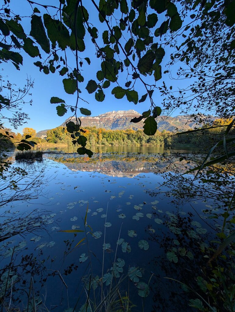 It extends to the south, through the western crest of the mountain chain,[8] passing by the Rocher de Lorzier (1,838 mts) and the Rochers de Chalves (1,845 mts); beyond the Crête d’Hurtières, to the east, rises the Charmant Som (1,867 mts).[1] To the west, La Grande Sure dominates Jura’s plateau[9] du Grand-Ratz (942 mts at its highest point).[1]