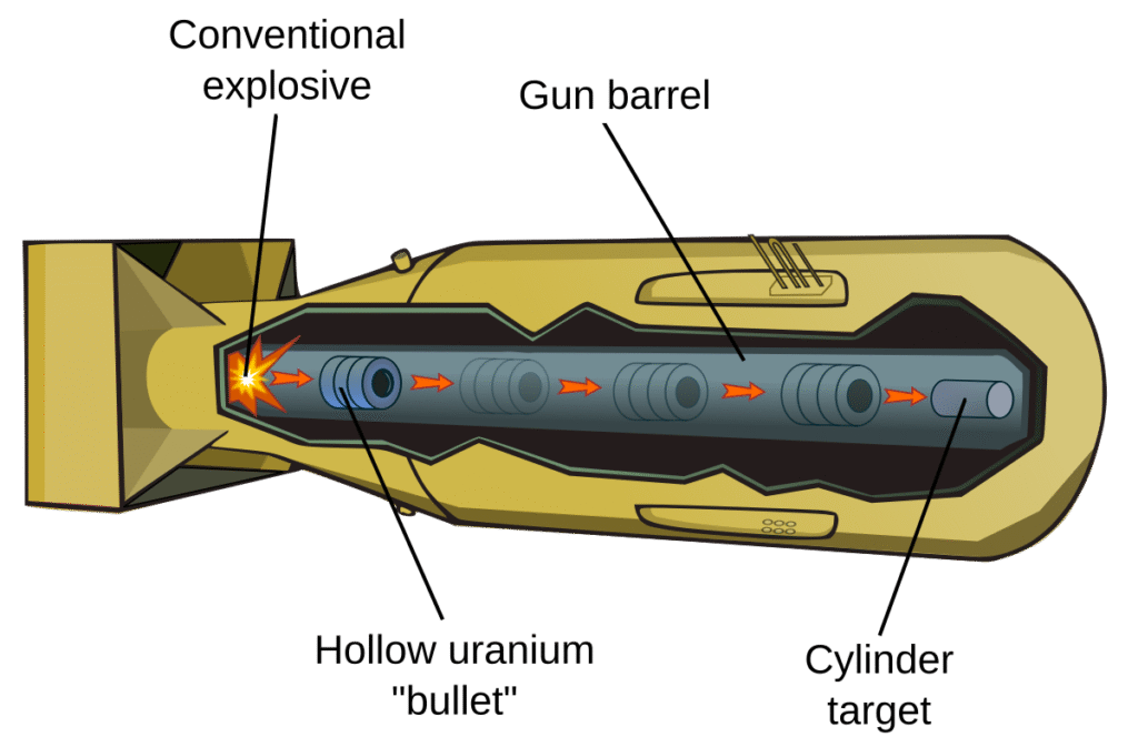The “gun” method is roughly how the Little Boy weapon, which was detonated over Hiroshima, worked, using uranium-235 as its fissile material. In the Little Boy design, the U-235 “bullet” had a mass of around 86 pounds (39 kg), and it was 7 inches (17.8 cm) long, with a diameter of 6.25 inches (15.9 cm). The hollow cylindrical shape made it subcritical. It was powered by a cordite charge. The uranium target spike was about 57.3 pounds (26 kg). Both the bullet and the target consisted of multiple rings stacked together.
