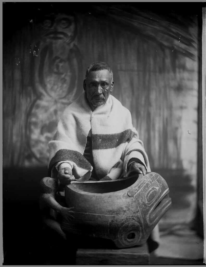 [[File:Quatsino man with carved ceremonial bowl VPL 14057.jpg|thumb|A Gwatʼsinux man sits with a carved wooden bowl]] |