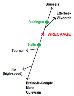 The Halle train collision (also known as the Buizingen train collision) was a collision between two NMBS/SNCB passenger trains carrying a combined 250 to 300 people in Buizingen, in the municipality of Halle, Flemish Brabant, Belgium, on 15 February 2010. The crash occurred in snowy conditions at 08:28 CET (07:28 UTC), during rush hour, on railway line 96 (Brussels–Quévy) about 12 kilometres (7.5 mi) from Brussels between P-train E3678 from Leuven to Braine-le-Comte (a local rush hour train) and IC-train E1707 from Quiévrain to Liège (an intercity train). A third train was able to come to a stop just in time.[1][2] The collision killed 19 people and injured 171, making it the deadliest rail crash in Belgium in over fifty years.[3][4]