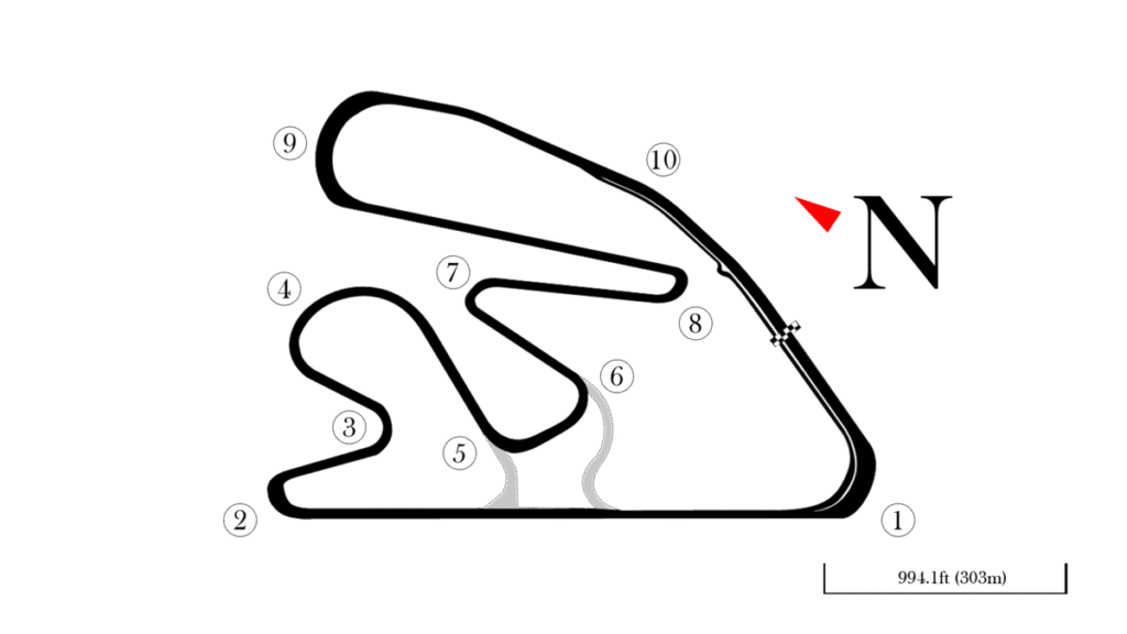 The track consists of two independent circuits that can be combined to form one large circuit. The direction of the circuits are clockwise. The track has a very smooth surface, and a mix of blind bends and crests which make it a challenging circuit for drivers.[3] The front straight is 950 m (3,120 ft) long with a kink in the middle and has an 11 m (36 ft) rise and fall, and the back straight is 750 m (2,460 ft) long. The National circuit, which incorporates the long front straight and pit facilities, is 2.700 km (1.678 mi) long with seven corners. The club circuit is 1.200 km (0.746 mi) long with four corners. Both tracks can combine into a 3.800 km (2.361 mi) circuit with six right-hand and four left-hand corners.[4]