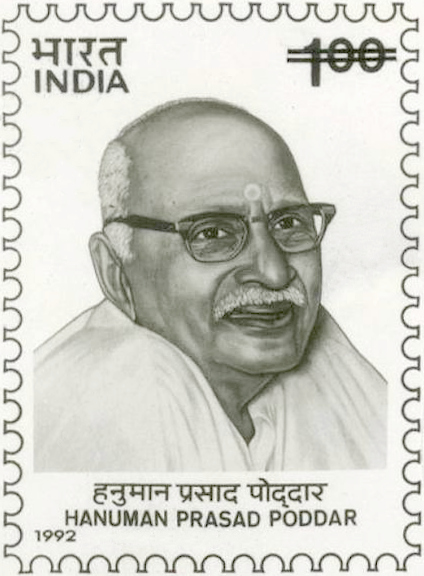 Pujya Shri Hanuman Prasad ji Poddar (18 September 1892 – 22 March 1971)[1] was an Indian Bhakt, Devotee, independence activist, littérateur, magazine editor and philanthropist. He was the founding editor of the spiritual magazine, Kalyan which was published by Gita Press setup by Pujya Shri Ghanshyam ji Jalan and Pujya Shri Jay Dayal ji Goeyendka. His work in fostering pride among the people regarding India’s history and philosophic tradition earned him praise from M.K. Gandhi. He was affectionally called “Bhai Ji” or “Lovingly Brother“. The Government of India issued a postage stamp in his memory in 1992.[2]