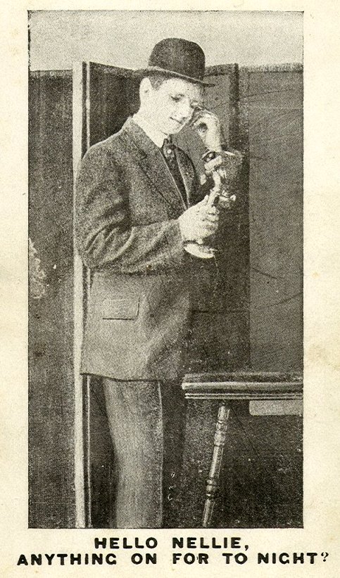 [[File:TelephoneHelloNellie.jpg|thumb|The greeting “Hello” became associated with telephones in the late 19th century. Postcard {{Circa}} 1905–1915]]