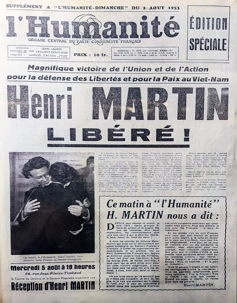 This affair put Martin in the spotlight as a symbol of the “struggle of the French people against the dirty Indochina War”. At the initiative of the French Communist Party, as well as intellectual and political elites, a defence committee was formed. Notable figures in support of Martin included Jean-Marie Domenach and his magazine Esprit, Jean Cocteau, and Jean-Paul Sartre, who at the end of 1953 published a book entitled The Henri Martin Affair.