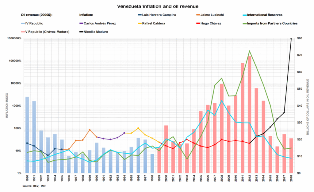 Venezuela’s historic inflation rate beside annual oil revenues.[1]