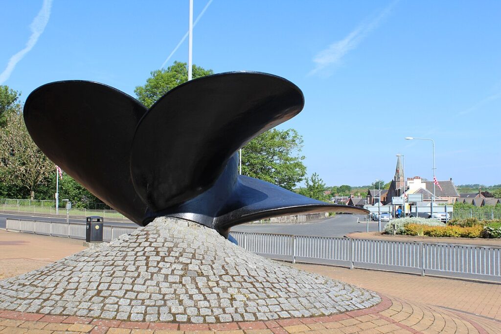 The village developed rapidly in the 19th century, following the discovery of coal. Fireclay and ironstone were also worked extensively until production ceased in the 1970s. A poignant reminder of the heyday of the iron and steel industry of Hurlford is the ship’s propeller erected at the Cross in the lately redeveloped town centre.[12]