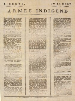 The Haitian Declaration of Independence, a key document in the history of Haiti, was given along with an Independence Day speech by Jean-Jacques Dessalines. The document was not written by Dessalines himself though, instead relying on his secretary, Louis Boisrond-Tonnerre, to transcribe his spoken words due to his inability to speak or write in French. Divided into three sections, the most substantive of the declaration itself is the prologue, titled “Le Général en Chef Au Peuple d’Hayti,” which translates to “The Chief General to the People of Haiti.”[5]