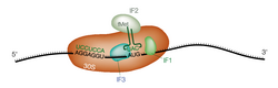 Initiation factors can interact with repressors to slow down or prevent translation. They have the ability to interact with activators to help them start or increase the rate of translation. In bacteria, they are simply called IFs (i.e.., IF1, IF2, & IF3) and in eukaryotes they are known as eIFs (i.e.., eIF1, eIF2, eIF3).[1] Translation initiation is sometimes described as three step process which initiation factors help to carry out. First, the tRNA carrying a methionine amino acid binds to the small subunit of ribosome, then binds to the mRNA, and finally joins together with the large subunit of ribosome. The initiation factors that help with this process each have different roles and structures.[2]