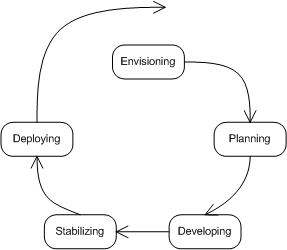 This model shows the five basic phases of the method. These phases will be explained in the following sections of this entry. The phases are: Envisioning, Planning, Developing, Stabilizing and Deploying. After this cycle has been completed a version of the system is ready and a new cycle begins to create a new version. The phases are explained in the following sections and are shown through a meta-modeling technique. More details about multiplicities and concepts in a project context can be seen in the overall data model later on.