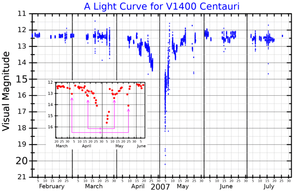 During 7 April to 4 June 2007,[a] telescopes of the Super Wide Angle Search for Planets (SuperWASP) and All Sky Automated Survey (ASAS) projects automatically recorded V1400 Centauri undergoing a series of significant dimming events for 56 days.[5] The pattern of these dimming events was complex yet nearly symmetrical, suggesting they were caused by an opaque, disk-like structure eclipsing the star. The light curve of V1400 Centauri during 2007 showed at least five major dimming events, including one long and very deep central eclipse bracketed by two pairs of shorter eclipses symmetrically occurring 12 days and 26 days before and after the middle of the deep eclipse.[6]: 5 The deep eclipse lasted about 14 days and blocked out at least 95% of V1400 Centauri’s light, causing it to dim by at least 3.3 magnitudes.[6]: 1 [b] The short eclipses before and after the deep eclipse blocked out at least 60% of the star’s light, causing it to dim by at least 1 magnitude.[6]: 1 [b]
