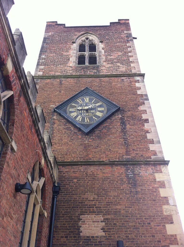 The clock on St Nicholas’ Church, Nottingham installed in 1830, but thought to be the face of the clock by James Woolley of 1726 from the Nottingham Exchange