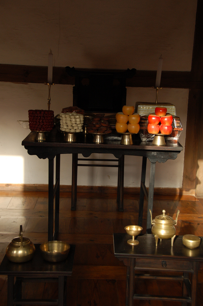 There are several kinds of ancestor rituals such as gijesa (기제사, 忌祭祀), charye (차례, 茶禮), seongmyo (성묘, 省墓), and myosa (묘사, 墓祀). Gijesa is a memorial service which is held on the day of the ancestor’s death every year. Gijesa is performed until upwards of five generations of ancestors in the eldest descendant’s house. Memorial services that are performed on Chuseok or New Year’s Day are called “charye”. On April 5 and before Chuseok, Koreans visit the tombs of their ancestors and trim the grass off the tombs. Then, they offer food, fruits, and wine, and finally make bows in front of the tombs. Memorial services that are performed in front of tombs are called “seongmyo”. Finally Myosa are performed at the tomb site in the lunar month of October to conduct in memory of old ancestors (five or more generations).