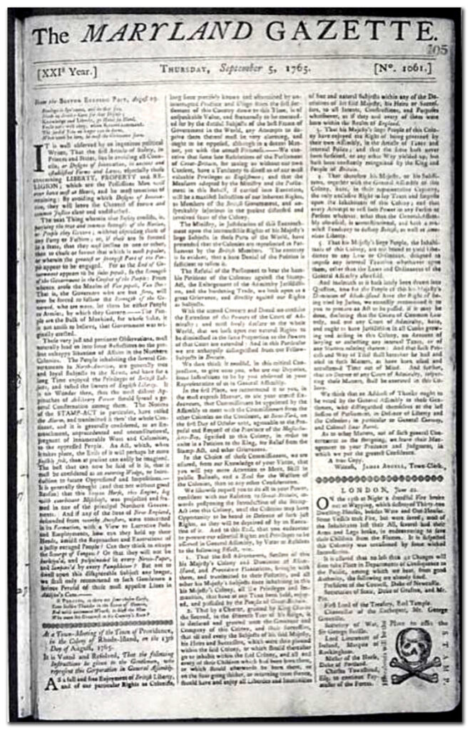 Maryland Gazette 5 Sept 1765. A skull and crossbones was displayed where the stamp should have been affixed.