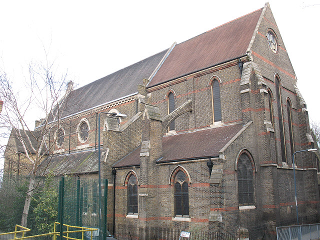 A ‘tin tabernacle‘ was placed on the site in 1868–1869, followed by permanent school buildings (1870–1871), probably to a design by W Shepherd,[2][3][4] with a schoolkeeper’s house by John William Walter, one of his very few identified designs in the UK before he sailed for the US with Peter Paul Pugin.[5] Fundraising for the permanent church began in 1873 and a foundation stone was laid two years later. Construction then had to pause until 1876 for lack of funds and vestry rooms, organ chamber, chancel and chancel aisle (all designed by Walter) were consecrated in 1878, with a planned tower omitted and the ‘tin tabernacle’ moved on rollers to act as a temporary nave.[6][7]