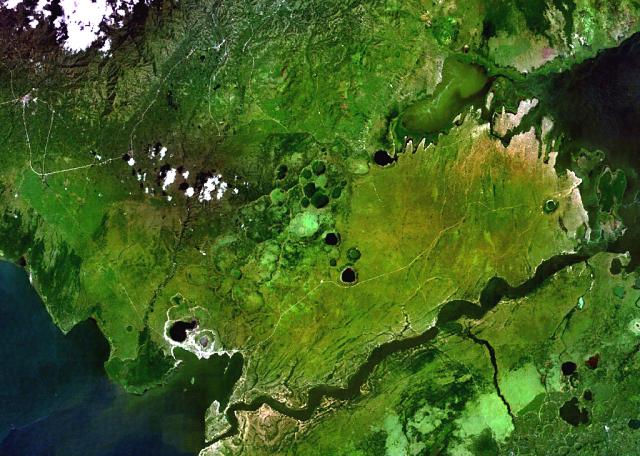 The Katwe craters or Katwe-Kikorongo explosion craters are a group of volcanic craters within Queen Elizabeth National Park in Toro, Uganda.[5] The volcanic field is roughly 210 km2 (81 sq mi) in size.[6] The individual craters vary widely in size, but the largest are up to 3 km (1.9 mi) in diameter and 100 m (330 ft) deep.[7] The unusual formations were formed individually by a series of violent volcanic explosions over the last 1 million years.[7] These maar craters are a result of magma coming in contact with groundwater driving large steam explosions. The explosive events created large, low lying craters with few other signs of volcanic activity.