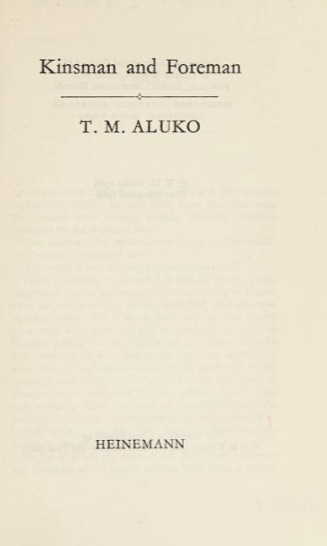 Kinsman and Foreman is a 1966 social novel by Nigerian novelist T. M. Aluko. The novel is one of the novels in the Heinemann African Writers Series.Though the civil servant protagonist attempts to resist the corruption in Nigeria, he cannot and is eventually transferred to a remote position for a job.[1] While representing the social corruption of Nigeria, the novel explores topics that build out of Aluko’s experience as a civil engineer.[2] Thematically, the novel focuses on the ethics and cultural conflicts that lead to the corruption.[1]