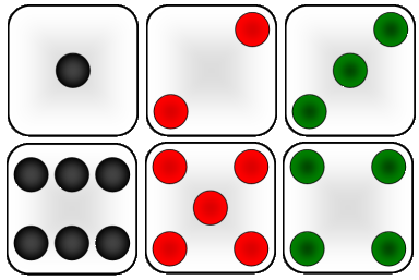 The Kismet Section is scored based on creating dice combinations similar to poker hands. It is in this section that the colored dice come into play, as they determine scoring criteria below: