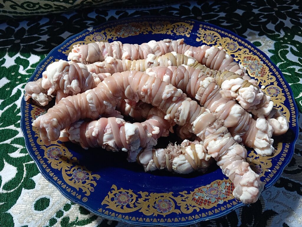Kourdass is a Moroccan and Algerian food similar to sausage made with lamb offal that is salted, marinated, sun-dried, then boiled. It is served for special events like weddings, festivals, Moussem, and Ashura.
