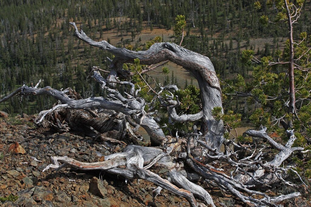 In the Alps in Europe, a scrubland of Pinus mugo is described as occupying the area above the tree line. This is formed by variants of the spruce, beech, and rarely the green alder. These European species were first labeled as a “krummholz belt” by scientists. In the Rocky Mountains, several tree species appear in a similar stunted form, such as specific North American variants of spruce, fir, and pine. These formations were sometimes called “elfin-wood” or “wind-timber”. However, English-speaking scientists began to refer to these formations as krummholz as well.[6]