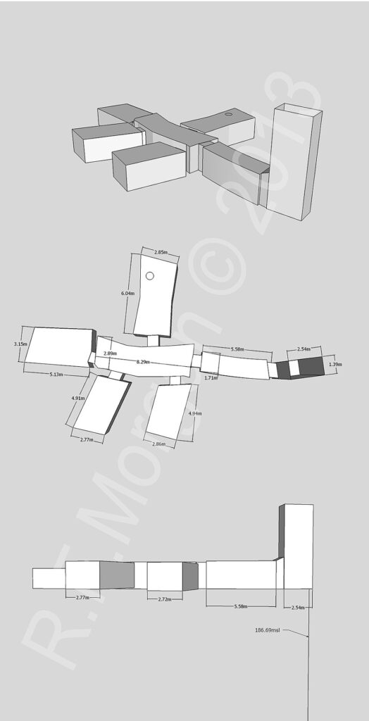 The layout consists of a vertical shaft 7 metres (23 ft) deep which opens onto a corridor that leads to one large chamber surrounded by four smaller rooms. It has a total length of 23 metres (75 ft).