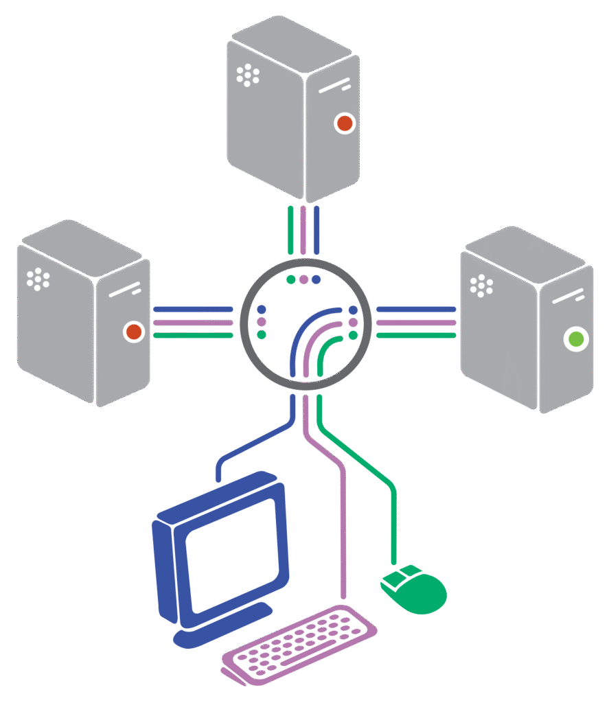 A KVM switch (with KVM being an abbreviation for “keyboard, video, and mouse”) is a hardware device that allows a user to control multiple computers from one or more sets of keyboards, video monitors, and mouse.[1]