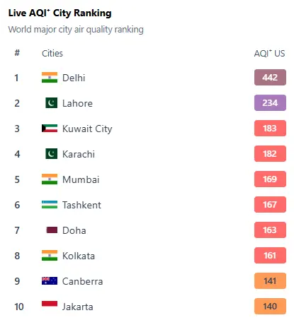 Karachi recorded an AQI of 182, falling in the “unhealthy” range and just barely behind Kuwait’s capital at 183. India’s Mumbai came in at fifth with an AQI of 169.