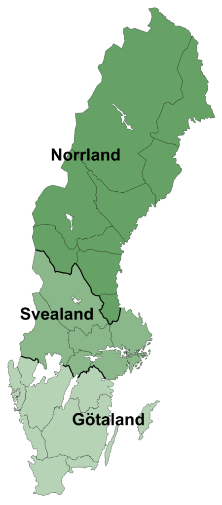 [[File:Sverigekarta-Landsdelar, namn och landskap.svg|thumb|The three lands of Sweden]]